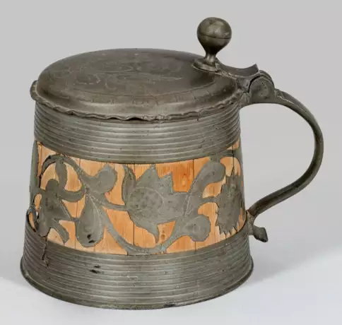 Zinn und Holz. Annähernd zylindrischer Korpus. Holzwandung mit umlaufend durchbrochen gearbeiteter Zinnmontierung mit stilisiertem, umlaufendem Blumendekor sowie mehrfach profiliertem breiten Rand- und Standbereich. Geschweifter Bandhenkel mit kugeliger Daumenrast. Auf dem Deckel graviert die Darstellung einer weiteren Blume. Besch.; H. 14,5 cm.