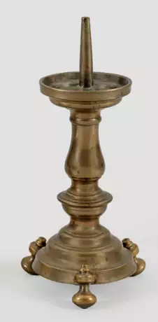 Messing. Über drei seitlich applizierten doppelten Kugelfüßen, aufgewölbter, mehrfach gestufter Stand, übergehend in einen Schaft mit Baluster und Scheibennodus. Gering vertiefte, ausschwingende Traufschale sowie hoher, sich konisch verjüngender Dorn.; H. 29 cm.