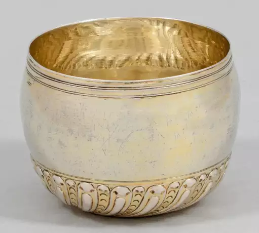 Silber, teilw. vergoldet. Auf leicht aufgewölbtem Boden gebauchter Becher mit mehrfach profiliertem Rand; die untere Wandung mit geschweiftem Zungendekor. Gest. Tremolierstrich, Beschaumarke, Meister Ferdinand Schönfeld (Meister seit ca. 1686). Gew. ca. 75 g. H. 5 cm.