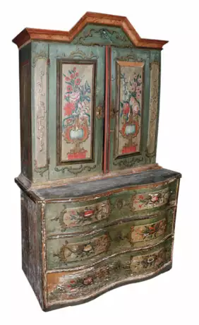 Geschwungene Barockkommode mit 3 Schubfächern. Aufsätz später, 2-türig, mit zwei Ablagen u. 2 Schubfächern. Reiche Bemalung mit Vögeln u. floralem Dekor. 200 x 118 x 65 cm.