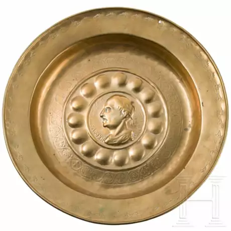 Flacher Teller aus Messing-Schlagblech mit gebördeltem Rand. Im Spiegel Brustportrait des Cicero mit Umschrift "MARCUS TULIVS CICERO CONS(UL)". Umlaufend Zierbuckel und geprägter Rankenfries. Die Fahne mit Zierpunzen dekoriert. Am Rand kleine Hängelochung. Rückseitig verlötete Hängeöse. Durchmesser 36 cm.
