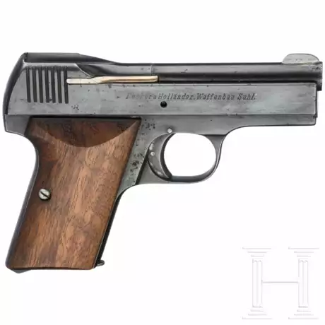 Cal. 7,65mmBrowning, SN. 34355, nummerngleich. Blanker Lauf, Länge 75 mm. Siebenschüssig. Beschuss Krone mit "N". Links gemarkt "Selbstlade-Pistole Beholla Cal. 7,65 D.R.P.", rechts "Becker & Holländer. Waffenbau Suhl". Links am Rahmen kaiserliche Abnahme Krone/got. Buchstabe. Originale Brünierung, stellenweise narbig. Glatte Nussholzgriffschalen. Magazin.