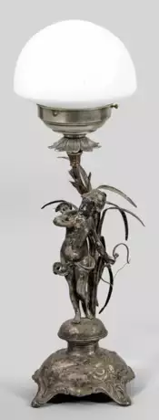1-flg.; Metall, versilbert und weißes Glas. Über geschweift ansteigendem, floral reliefiertem Sockel vollplastisch gestaltete Amorette sowie schlanker Schaft mit Schilfblatt als Träger für Leuchtmittel mit kuppelförmigem Lampenschirm. Elektrifiziert. Erg.; H. 54 cm.