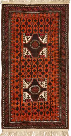 Persien. Wolle auf Wolle. Im rotbraunen Innenfeld zwei große Rautenmotive sowie flächendeckende Rapportmusterung aus Rosetten. Umlaufend mehrteilige Ornamentbordüre. 204 cm x 108 cm.