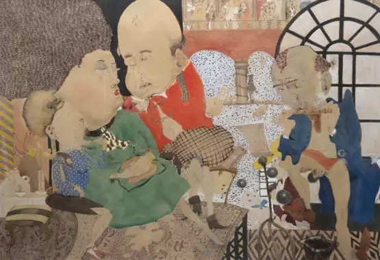 Lot 41 | Bergner, Ralf (1950 Breitenbach bei Zeitz) "Gesellschaft", Tempera/ Farbstift, sign., 69x98,5 cm, im Passepartout hinter Glas und Rahmen