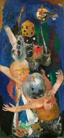 Notation: Signed upper right: Heisig. Signed, titled and dated on the verso: Bernhard Heisig Würfelspiel 89. There are also several crossed-out inscriptions here.
