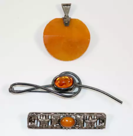 Bernsteindose, Brosche Danzig in 925 Silber, Fischbrosche mit Bernsteincabochon, Änhanger Art Déco (Ungestempelt) Stein mit Randbestossungen u. ein Manschettenknopf.