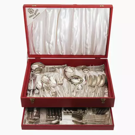 Besteckkasten bestehend aus jeweils 12 gr. Messern (Klingen"Raadvad Knivfabriker Rustfri" und Krone), gr. Gabeln, Löffeln, 12 mittl. Messern (Klingen "Georg Jensen Denmark" "Stainless Steel"), Gabeln, Löffeln, 6 kl. Messern, 11 Teelöffeln, 10 Mokkalöffeln, 12 Kuchengabeln, 6 kl. Aufschnittgabeln, 3 mittl. Fleichgabeln, 1 gr. Serviergabel, 2 kl. Anbiet(Austern)gabeln, 1 gr. und 1 kl. Vorlegelöffel, 1 Saucenkelle.