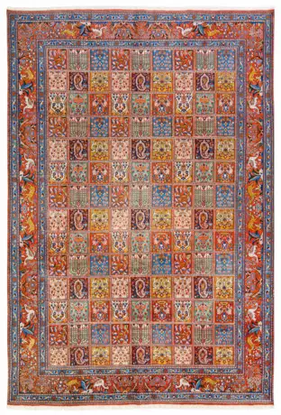 Persien. Wolle auf Baumwolle. Im Innenfeld flächendeckende Feldermusterung aus unterschiedlichen Nischen- und Vasenmotiven sowie Bothéblüten, begrenzt von schmalen Bändern. Umlaufend rotgrundige Bordüre aus unterschiedlichen Blüten und Vögeln. 245 cm x 364 cm.