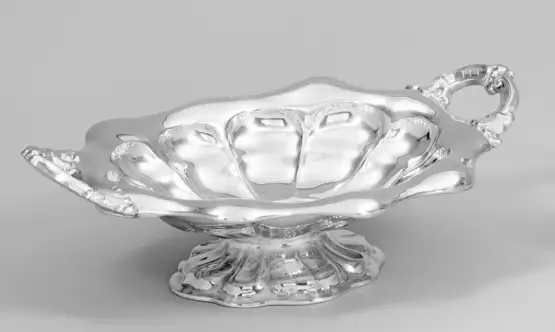 Silber. Ovale Grundform. Aufgewölbter Stand, übergehend in stark eingezogenen, kurzen Schaft und weit ausschwingende Schale mit gegenständigen Henkeln. Stand und Korpus umlaufend umzogen von breiten, gebuckelten, zungenförmigen Godronen. Passig blütenförmig geschweifter Rand, Henkel mit Rocailledekor reliefiert. Minim. gerissen/rest.; Gest. 13 Lot, Firma J. H. Ph. Schott und Söhne (tätig 1811 -1869). Gew. ca. 325 g. H. 11 cm. 33,5 cm x 24 cm.