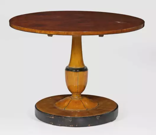 Nussbaum, Kirschbaum und Mahagoni, furniert. Über runder Sockelplatte gegliederter Balusterschaft als Träger für runde Deckplatte. H. 74 cm. D. 98,5 cm.