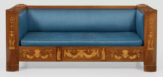 Helles Mahagoni, furniert sowie Einlagen aus Ahorn. Gerade Zarge, flankiert von breiten, schauseitig gewölbten Armlehnen. Flache Rückenlehnenrahmung. Flächendeckend teilw. figurale Einlagen. Lose Polsterauflage. H. 80 cm. 190 cm x 71,5 cm. Sitz-H. 40 cm.