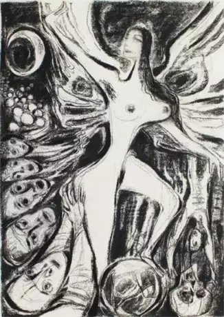 Geschenk des Künstlers an den Sammler. - "A winged female figure who attracts the men who perish through her." Charcoal drawing. 50 x 36 cm.