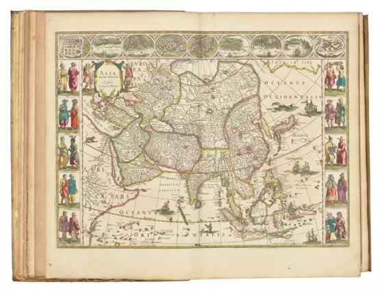 2 volumes, folio (502 x 340mm). Engraved allegorical title-pages with mounted letterpress overslips, 204 double-page engraved maps, of which 7 folding, and 3 maps within text, all coloured by a contemporary hand (map I.24 ‘Gallia Le Royaume De France’ [4000:2A.3] is pasted over a copy of map I.70 of ancient Gaul, ‘Typus Galliae Veteris’ [4000H:2B], which has been printed in error on the descriptive letterpress sheets that accompanies the former map, a few plates lightly creased or splitting along centrefold, this latter affecting maps II.85 ‘India quae Orientalis dicitur,’ 91 ‘Nova Virginae Tabula,’ and II.97 ‘Novus Brasiliae Typus’, a number of old paper repairs sometimes affecting a few letters or words of letterpress including leaf **2 in vol. I, variable browning throughout with map I.5 ‘Americae nova Tabulae’ very browned with a marginal repaired tear just into image, map II.24 ‘Rhenus Fluviorum Europae celeberrimus’ with 180mm tear and map II.26 ‘Clivia Ducatus Et Ravenstein Dominium with 210mm tear, maps II.62-63 with some marginal worming). Contemporary vellum, covers panelled in gilt, spine with raised bands in 8 compartments tooled with gilt foliate scrolls, edges gilt, green silk ties (tailcaps splitting to both volumes with that to vol. I almost detached, some soiling to covers, extremities rubbed, lacking silk ties to vol. II). Provenance: old ink library classmarks in lower margins of armorial titles.