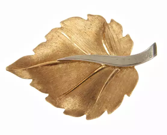 2. Hälfte 20. Jh., Weiß- und Gelbgold gestempelt 750, in Form eines geschwungenen, satinierten Blatts mit Stiel aus Weißgold, geringe Tragespuren, Maße ca. 32 x 44 mm, G ca. 6,9 g.