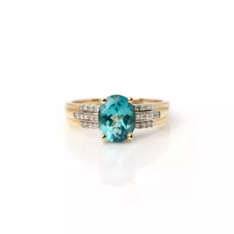 585 yellow gold, hallmarked, 22 diamonds, total approx. 0.22 ct, and one oval-cut blue topaz, approx. 2.25 ct, ring size 56, weight approx. 4.3 g