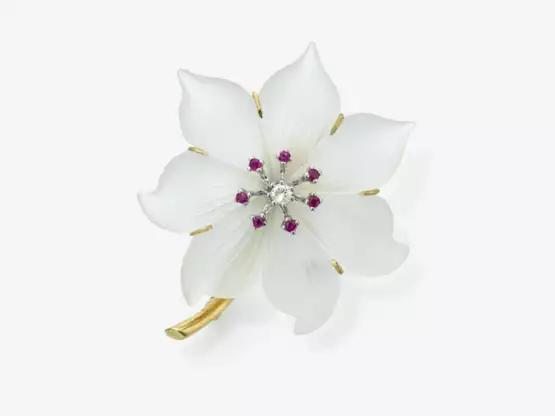 Lot 92 | A floral brooch with agate, brilliant-cut diamond, and rubies