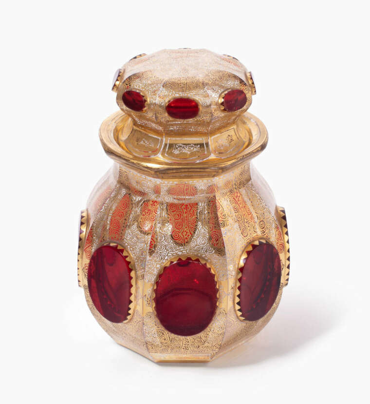 2. Hälfte 19.Jh. Farbloses Glas. Facettenschliff und hochgeschliffene, rubinierte Ovalmedaillons. Reiche, ornamentale Vergoldung. H 13,5 cm.