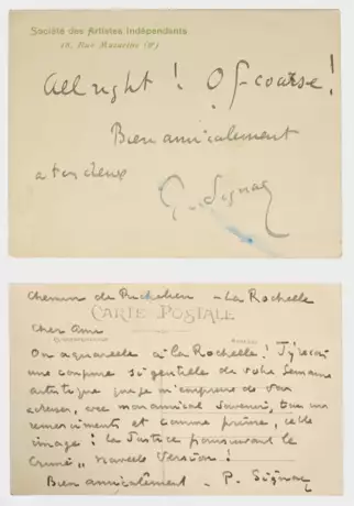 Eigenhändiger Brief auf der Rückseite einer Ansichtskarte ("Saint-Martin-de-Ré - Le forcat cul-de-jatte Bernard s’embarquant pour la Guyane"), Unterschrift, La Rochelle, ohne Datum.Beigegeben Karte mit eigenhändigen Grüßen und Unterschrift, Briefkopf der "Société des Artistes Indépendants" in Paris. Der französische Maler und bedeutendste Künstler des Neoimpressionismus, Paul Signac (1863-1935) berichtet einem befreundeten Künstler von seinen Aquarellarbeiten auf La Rochelle und bedankt sich bei ihm für dessen Urlaubsgrüße mit dem auf der Vorderseite der Karte abgebildeten Foto eines beinamputierten Sträflings, der nach Guyana abtransportiert werden soll: „…la Justice poursuivant le Crime, navale Version!“ (Die Gerechtigkeit verfolgt das Verbrechen, Marineversion!). 8,8 cm x 13,8 cm. Minim. Alters- und Gebrauchsspuren.