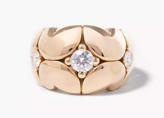 Péclard, Zürich. 750 Gelbgold. Drei Brillanten, G/if-vvs, zus. 0.64 ct. in eine bombierte, zart durchbrochene Ringschiene eingefasst. Gr. 46, 14 g. Mit Rechnung von 2006 und Box.