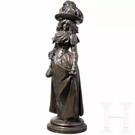 Bronze. Auf runde Plinthe aufgesetzte schwere Bronzestatue einer vornehm gekleideten Dame mit üppigem Federhut. Ganz leicht fleckig. Höhe 52 cm.