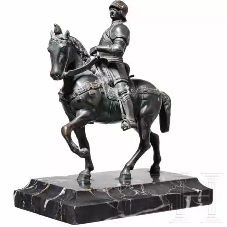 Mehrteilig aus Bronze gegossene und dunkel patinierte Figur nach dem berühmten Vorbild Andrea Verrocchios in Venedig. Auf schön gemaserter Marmortafel mit profiliertem Rand. Kleiner Gussfehler auf der Rückseite des Sattels, stellenweise bestoßen. Der rechte Arm etwas gelockert. Maße ca. 25 x 20 cm.