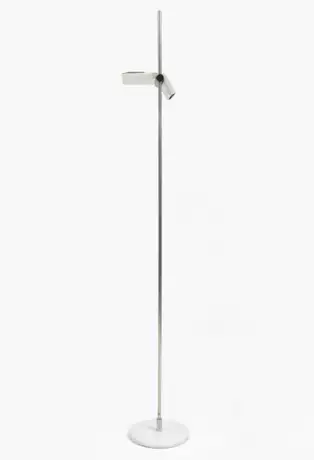 Entwurf 1970er Jahre. Ausführung Arteluce, Mailand. Metallrohr verchromt, weiss lackiertes Metall. Herstelleretikett. Höhenverstell- und drehbar. Funktionstüchtig. H 197 cm.