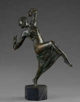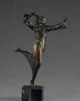 Bronze, farbige Kaltbemalung. Sign. unter seinem Pseudonym "F. Mazura". Hellgrüner Onyxmarmorsockel. In dynamisch-graziöser Pose stehende, nur mit einem Lendenschurz bekleidete Tänzerin, die mit erhobenem rechten Bein und ihren Händen den Reifen balanciert. Zach studierte Bildhauerei an der Wiener Akademie bei Hans Bitterlich und Josef Müllner. Seine Hauptschaffensperiode und sein künstlerischer Höhepunkt lagen in der Zwischenkriegszeit von 1918 bis ca. 1935. Außer Sport- und Tiermotiven stellte er mit Vorliebe Tänzerinen und junge Frauen dar, die oft freizügig erotisch bis frivol waren oder sogar aufreizend sadomasochistische Themen widerspiegelten. H. 27,5 cm.