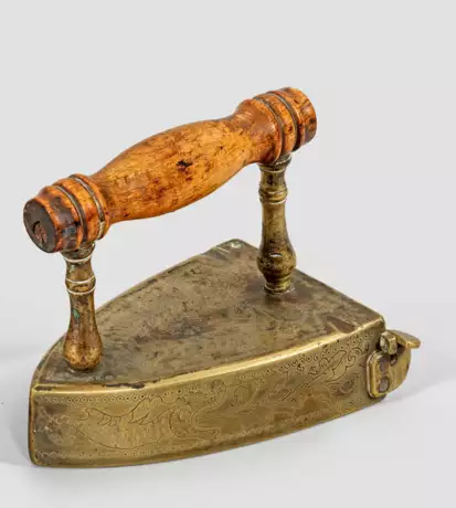 Messing. Dreiseitiger, flacher Korpus. Seitlich verriegelbare Verschlussklappe. Balusterförmig gegliederte Stützen mit gedrechseltem Holzgriff. Allseitig gravierter Floraldekor, auf den Längsseiten mit geschuppten Fischwesen, oberhalb Blütenkranz mit Dat. 1774. H. 12,5 cm.