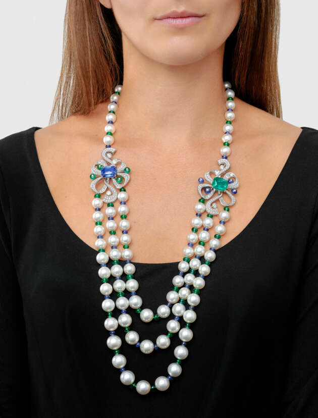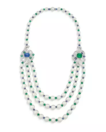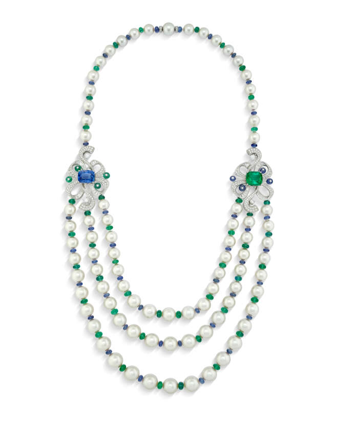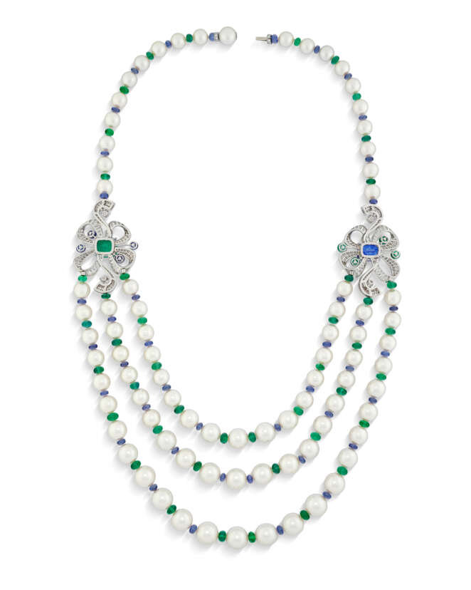 Lot 54 | BULGARI SAPPHIRE, EMERALD, DIAMOND AND CULTURED PEARL 'FIOCCO REALE' NECKLACE
