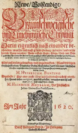 VD17 39:127548L; NDB II, 741. - Von dem Helmstedter Juristen bearbeitete und bis auf 1620 ergänzte Chronik, zuerst 1584 erschienen. - Mit Ansichten von Braunschweig, Göttingen, Hannover, Hildesheim (wiederh.) und Lüneburg. Der blattgroße Wappenholzschnitt zeigt in allegorischer Aufteilung die Länder Heinrichs des Löwen. - Gleichmäßig tls. stärk. gebräunt.