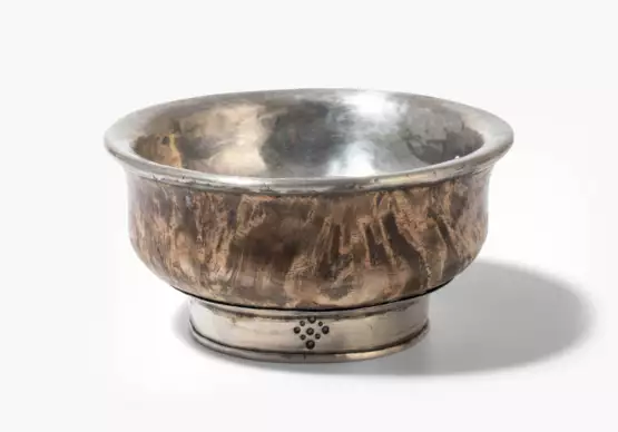 Tibet, 20.Jh. Holz lackiert, mit Silbermontur. D 11 cm.