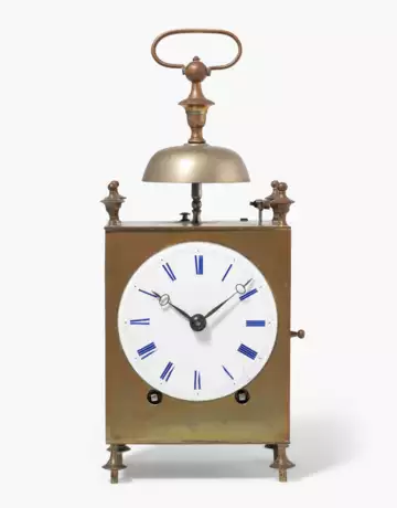 Frankreich, um 1820. Messinggehäuse mit vasenförmigen Eckaufsätzen. Eingemittete Glocke mit Traggriff. Emailzifferblatt mit römischen Zahlen. Gebläute Stahlzeiger. Werk mit Federaufzug, Spindelhemmung und Fadenpendel. Halbstundenschlag auf Glocke. Gangfähig. Schlüssel vorhanden. Höhe 28 cm.