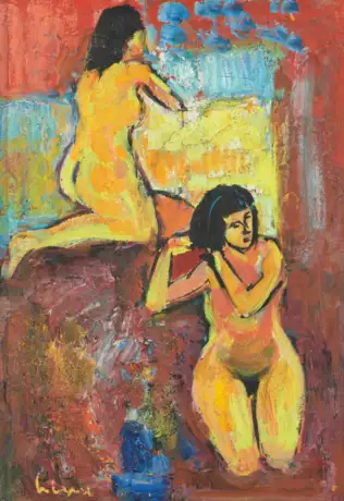 Deux nus, posant. 1950/51. Öl auf Sperrholzplatte. Unten links signiert. 52,2x37,7 cm. Gerahmt.
