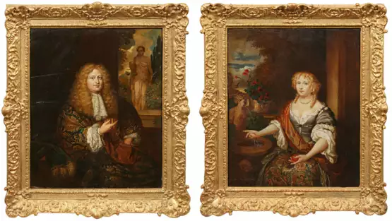 Gegenstücke. Feinmalerisch ausgeführte Darstellungen nach dem bekannten Gemäldepaar Netschers von 1679/80 in der Gemäldegalerie der Staatlichen Museen zu Berlin (Inv.-Nr. 850B und 850ßC), das sich zuvor bis 1893 in Berliner Privatbesitz befand. Die beiden Porträtierten sind ganz offensichtlich Angehörige einer sehr wohlhabenden Schicht von hohem Status, es dürfte sich mit Sicherheit um hochstehende Persönlichkeiten mit engeren Bezügen zum Haager Hof handeln. Auf beiden Bildnissen ist das Motiv der Orange zu sehen, augenfällige Hinweise auf die regierende Statthalterfamilie der Oranier in den Niederlanden. Der stattliche Herr wird in selbstbewusster, das Bild dominierende Pose dargestellt, die im Hintergrund platzierte Justitia-Statue ist wohl ein Hinweis auf seine Stellung als Richter oder Magistrat. Im Gegensatz hierzu ist die porträtierte Dame, graziler und zierlicher geschildert, ihr üppiger Perlenschmuck symbolisiert nicht nur Reichtum, sondern kann sich auf auch andere Eigenschaften wie Reinheit, Liebe, Keuschheit und Schönheit beziehen. Öl/Holztafel. 60 cm x 50 cm. Rahmen.