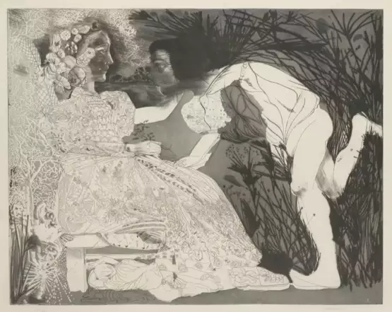 (1933 Pontevedra/Spanien, lebt in New York). Abstrakte Darstellung. Radierung/Papier, re. u. sign. und dat. (19)75 sowie li. u. Ex. E.A. Plattenmaß ca. 49x 59 cm. Gerahmt.
