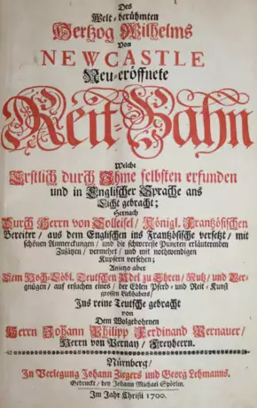 Mennessier de la Lance II, 250. Nissen 852. Vgl. Lipperheide Tc 31. - Erste dt. Ausgabe des seltenen, prachtvoll illustrierten Pferdebuches mit deutsch-franz. Paralleltext. Die schönen Kupfertafeln zeigen verschiedene Pferderassen, das Training, zahlreiche Figuren und wie der Reiter zu sitzen hat, die Zucht, das Herdenverhalten, Steigbügel, Sattel, Mundstücke und vieles mehr. Drei Tafeln mit großartigen Darstellungen des Autors zu Pferde, umgeben von aufwendiger Staffage und barocken Allegorien. Im Vorwort heisst es, "dass man daraus nicht allein die Gestalt des Reuters in allen Schulen, sondern die natürlichen, und auch die künstlichen Bewegungen und Geberden der Pferde nach Wunsch ersehen kann". - Die Tafeln 2 oder 3 u. 8 fehlen. Exlibris. Wenige kleine Einrisse in die Darstellungen (Kupfertitel etwas größer). Leicht fleckig, insgesamt schön erhalten. - ╔Vorgebunden╗ (in einzelnen Oktav-Lagen): Fuchs,J. Vollkommenes Ross-Artzney-Buch. Worinnen viele gute, bewährte Artzney-Mittel und Sympathetische Künste zu finden. Lpz. 1721. 4 Bl., 216 S., 8 Bl. - Schrader 666.