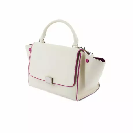 Description: Cream coloured and purple leather. Single handle, side snap buttons allow flexible shaping. Zipper compartment on the back, large inner compartment with two pockets. Dust bag and removable shoulder strap enclosed.
