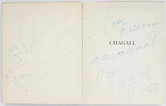 Die Einbandillustration und die ganzseitigen farbigen Abbildungen gedruckt von Fernand Mourlot. - Ränder gering gebräunt. Vorsatz u. Vortitel mit ╔ganzseitiger, eigenhändiger Widmung mit Unterschrift sowie Federzeichnung von Marc Chagall, datiert 1968.╗ Widmungsempfängerin "Pour Rosemary amicalement..." ist sicherlich Lady Rosemary d'Avigdor-Goldsmid. Im September 1963 war Sarah, ihre Tochter, bei einem Segelunglück zu Tode gekommen. Nachdem Lady Rosemary in einer Pariser Ausstellung Chagalls Entwürfe für das Hadassah-Krankenhaus in Jerusalem gesehen hatte, nahm sie Kontakt mit Chagall auf und konnte ihn gewinnen, Fenster für die Dorfkirche von Tudeley/Kent zu entwerfen. 1967 wurde das erste Fenster eingesetzt.