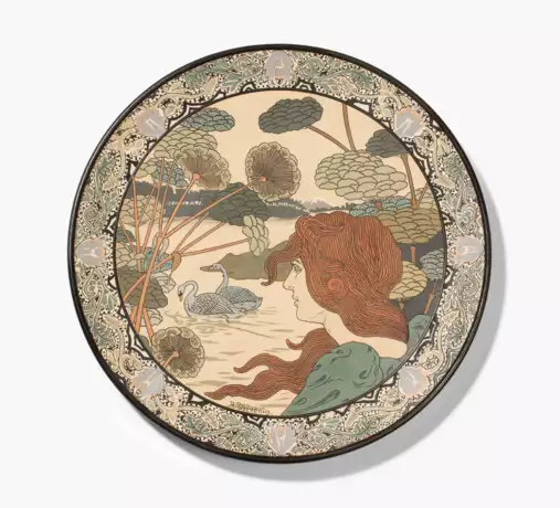 Entwurf um 1895, Ausführung Villeroy & Boch. Chromolith-Steinzeug. Signiert "R. Thévenin." Im Stand Manufakturmarke (Turmmarke, geprägt) sowie Modellnummer "2542" (geprägt). D 40 cm.