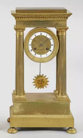 Bronze, teilw. vergoldet. Architektonisch gegliederter Korpus aus Vollsäulen. In der Mitte profilgerahmtes, teilw. guillochiertes Zifferblatt mit Emailziffernring. Pendulenwerk mit Pendelfeder sowie Schlagwerk auf Glocke. H. 41 cm. 22 cm x 12 cm.