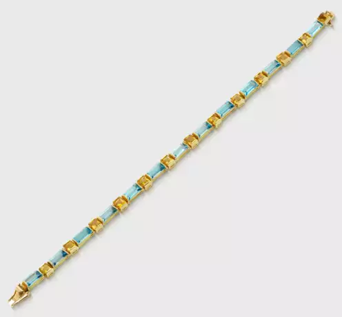Gelbgold, gest. 750. Linear besetzt mit blauen Topasen und gelben Citrinen von zus. ca. 10,01 ct. im Tafel- bzw. Carréschliff. L. ca. 19 cm. Gew. ca. 14,11 g.