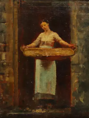 (1834 La Guillotière (Lyon) - Lyon 1886). Ein Dienstmädchen mit einem großen, flachen Korb in der Haustür. Ölstudie auf geriffeltem Holz. Ca. 35 x 26 cm. Ob. re. sign. Gerahmt.