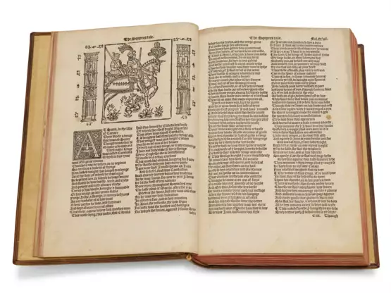 Folio (317 x 209mm). Title and part-titles within woodcut borders, 20 woodcuts within the text illustrating The Canterbury Tales, woodcut initials, text printed in double column (title and 23 leaves supplied from another copy, the final leaf provided in expert facsimile, title window-mounted with small repaired wormholes and a few areas in manuscript facsimile, several leaves restored in margins occasionally affecting printed area, some repaired tears into text, minor marginal worming, scattered stains). Modern blindstamped sheep (spine and upper board slightly faded). Provenance: some 16th- and 17th-century English annotations, marginal markings and manicules, including a recipe for producing ink using ‘a quart of claret wine’.