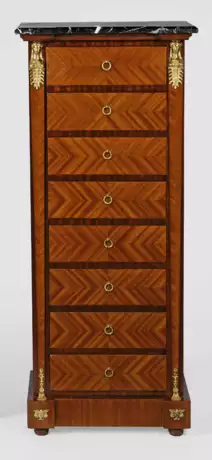Mahagoni, furniert. Gerader, hochrechteckiger Korpus auf gekantetem Sockel. In der gegliederten Front acht Schubladen, flankiert von eingestellten Karyatiden. Deckplatte aus grau-weiß gemasertem Marmor. H. 134 cm. 57 cm x 35 cm.