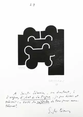 In gutem Zustand. Prachtvoller und tiefschwarzer Druck mit dem vollen Rand. Die Holzmaserung bei der nahezu formatfüllenden Darstellung fein mitdruckend. - Ohne die anderen 7 zum Werk gehörenden Graphiken. Druckvermerk von Chilida signiert. Aufl. 150 Ex., davon wurden nur die ersten 50 Ex. signiert - 1 woodcut on double-sided wove paper. Signed and numbered. Enclosed in the accompanying book. Below the woodcut as well as the left of the double page with typographic tex. - In good condition. Excellent and deep black impression with the full margins. The wood grain finely printed on the nearly full size depiction. - Printer's mark signed by Chilida. Edition of 150 copies, of which only the first 50 copies were signed. Including: - The book with the text by Emile M. Cioran, loose in original cardboard slipcase. Signed by author and artist in the imprint. - Excluding the 7 other prints.
