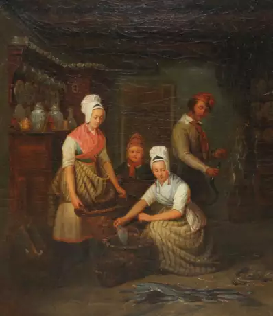 (1797 Boulogne-Billancourt - 1857 ?). Fischerfamilie in der Küche. Öl auf Lwd. auf Holz genagelt, 1837. 60 x 49 cm. Sign. und dat. - Craquelée, rechts unten Fehlsstelle circa 0,5 x 1,5 cm.