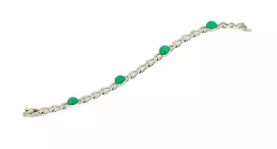 Description: Classic curb chain bracelet with four round chrysoprase cabocohns in bevel prong settings.