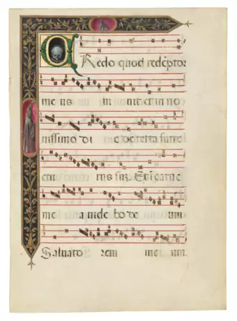 262 x 186mm. The initial opening a responsory for the Office of the Dead, (‘Credo quod redemptor […]’ ), six lines of text and music on 4-line staves in red, two large decorated penwork initial, marginal penwork flourishing, with two-sided panel border with foliate emerging from a vase in gold on a black ground, incorporating two cartouches, both with robed figures, one kneeling, the other holding a censer, in grisaille on a red ground (some slight fading of ink, tiny almost imperceptible hole at base of inner border). Pasted into window mount at edges.