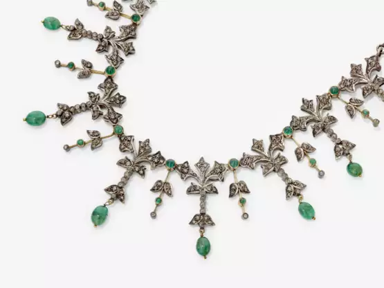 Yellow gold 333/- and silver, assayed. Approx. 282 rose-cut diamonds. Approx. 25 cabochon-cut emeralds and flat pearls. A few rose-cut diamonds are missing. The necklace was added later. Length approx. 38.5 cm. Ca. 46.4 g.